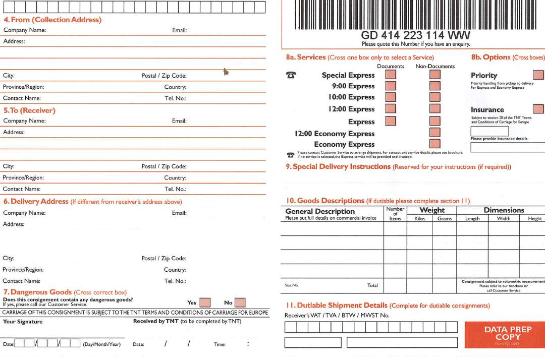 TNT broj nosioca troškova transporta. U slučaju da pošiljka ide o trošku Pošiljaoca, ne popunjava se.